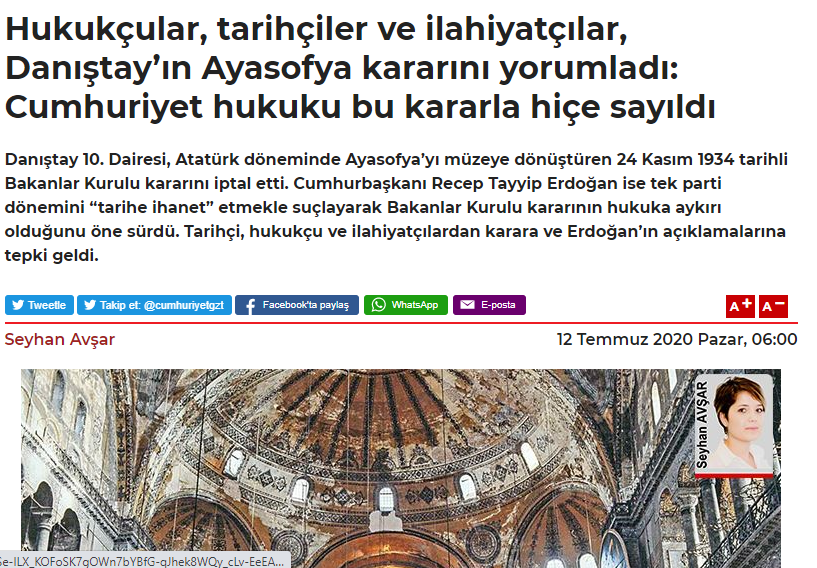 Υπό τον τίτλο “Νομικοί, ιστορικοί και θεολόγοι ερμηνεύουν την απόφαση για την Αγία Σοφία: Αγνοήθηκαν οι δημοκρατικοί νόμοι στην λήψη της απόφασης” η αντιπολιτευόμενη εφημερίδα Τζουμχουριέτ στην Τουρκία φιλοξενεί τις απόψεις ιστορικών, νομικών και θεολόγων, οι οποίοι χαρακτηρίζουν την απόφαση του ΣτΕ ως παράνομη και “προδοσία της ιστορίας”