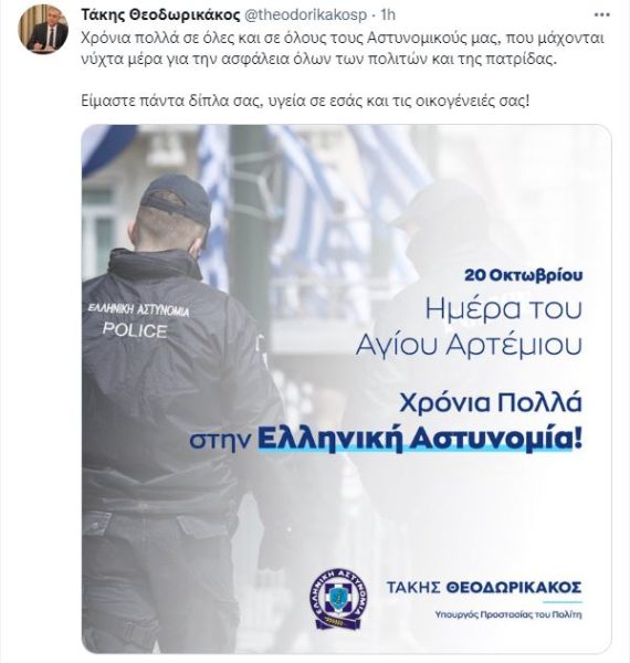 Με αφορμή τον εορτασμό της μνήμης του μεγαλομάρτυρα Αγίου Αρτεμίου, προστάτη της Ελληνικής Αστυνομίας, ο Υπουργός Προστασίας του Πολίτη Τάκης Θεοδωρικάκος απηύθυνε στις μήνυμα, στο οποίο τους ευχαριστεί τους αστυνομικούς για την αποτελεσματικότητά τους στην αντιμετώπιση του εγκλήματος και θέτει το πλαίσιο δράσης για μια σύγχρονη, ανθρώπινη, Αστυνομία, ικανή να ανταποκριθεί στις νέες προκλήσεις.