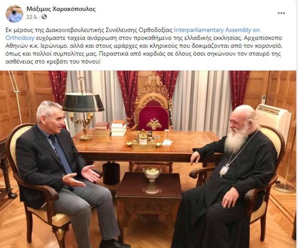 Με ανάρτησή του ο κ. Μάξιμος Χαρακόπουλος εκ μέρους της Διακοινοβουλευτικής Συνέλευσης Ορθοδοξίας ευχήθηκε στον Αρχιεπίσκοπο Αθηνών και πάσης Ελλάδος κ.κ. Ιερώνυμο για ταχεία ανάρρωση. Συγκεκριμένα έγραψε στην ανάρτησή του: “Εκ μέρους της Διακοινοβουλευτικής Συνέλευσης Ορθοδοξίας (Interparliamentary Assembly on Orthodoxy) ευχόμαστε ταχεία ανάρρωση στον προκαθήμενο της ελλαδικής εκκλησίας, Αρχιεπίσκοπο Αθηνών κ.κ. Ιερώνυμο, αλλά και στους ιεράρχες και κληρικούς που δοκιμάζονται από τον κορονοϊό, όπως και πολλοί συμπολίτες μας. Περαστικά από καρδιάς σε όλους όσοι σηκώνουν τον σταυρό της ασθένειας στο κρεβάτι του πόνου!”