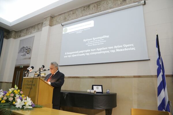 Πραγματοποιήθηκε στην Εταιρεία Μακεδονικών Σπουδών, στα πλαίσια του επετειακού έτους των 80 χρόνων της, η ομιλία του Κρίτωνος Χρυσοχοΐδη, Ομοτίμου Διευθυντού Ερευνών Ινστιτούτου Ιστορικών Ερευνών / Εθνικού Ιδρύματος Ερευνών, με θέμα: Η διαχρονική μαρτυρία των Αρχείων του Αγίου Όρους για την εξακτίνωση της ελληνικότητας της Μακεδονίας.