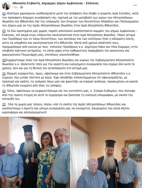 Στην απόφαση της Διαρκούς Ιεράς Συνόδου της Εκκλησίας της Ελλάδος να εγκρίνει τη μεταβολή των ορίων των Μητροπόλεων Φωκίδος και Φθιώτιδος μέσω της υπαγωγής των Ενοριών των Κοινοτήτων Μπράλου και Παλαιοχωρίου του Δήμου Αμφικλείας – Ελάτειας της Π.Ε. Φθιώτιδος από την Ιερά Μητρόπολη Φωκίδος στην Ιερά Μητρόπολη Φθιώτιδος, κάνει αναφορά η Δήμαρχος Αμφίκλειας – Ελάτειας Αθανασία Στιβακτή με μήνυμα της σε μέσο κοινωνικής δικτύωσης.
