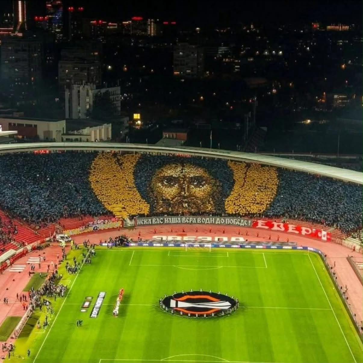 Στο κατάμεστο στάδιο “Ράικο Μίτιτς” στο Βελιγράδι – παρακολούθησαν περίπου 47.000 θεατές – οι οργανωμένοι φίλαθλοι του Ερυθρού Αστέρα, γνωστοί και ως «Delije», πριν την έναρξη του παιχνιδιού, ύψωσαν ένα τεράστιο κορεό στο οποίο απεικονιζόταν η μορφή του Οσίου Συμεών του Μυροβλήτη, ο οποίος εχθές εόρταζε.