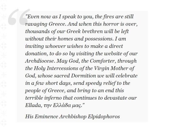 «Απευθύνω έκκληση προς όλες τις ενορίες της Αρχιεπισκοπής μας, να διενεργήσουν έρανο» είπε ο Σεβασμιώτατος Αρχιεπίσκοπος Αμερικής κ. Ελπιδοφόρος σε έκτακτο μήνυμα του, με σκοπό την άμεση ενίσχυση των πυροπλήκτων της Ελλάδας. Καλεί, επίσης, τους πιστούς των Ηνωμένων Πολιτειών σε απευθείας δωρεές μέσω της επίσημης ιστοσελίδας της Αρχιεπισκοπής Αμερικής.