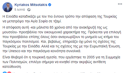“Η Ελλάδα καταδικάζει με τον πιο έντονο τρόπο την απόφαση της Τουρκίας να μετατρέψει την Αγία Σοφία σε τζαμί’, τονίζει ο Πρωθυπουργός Κυριάκος Μητσοτάκης σχετικά με το ζήτημα της απόφασης της Τουρκίας να μετατρέψει την Αγία Σοφία σε τζαμί.