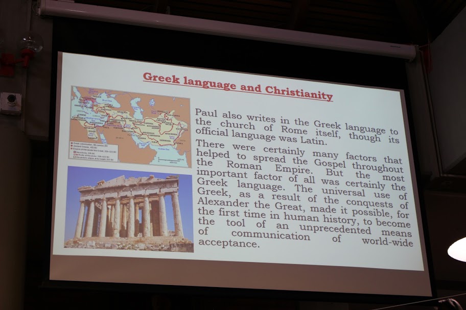 Ο Αρχιμανδρίτης Τιμόθεος Καψάλης με την εισήγησή του «Ελληνική Γραμματεία και Χριστιανισμός» αρχικά ανέφερε ότι η παρουσίασή του διαπραγματεύεται σε γενικές γραμμές την αποτύπωση της Ελληνιστικής γλωσσολογίας στην διαμόρφωση της Βιβλικής και λογοτεχνικής γραμματείας του Χριστιανισμού τον 1ο αι. μ.Χ. Στη συνέχεια αναφέρθηκε στη σημασία της ιστορικής Οικουμενικότητας της Ελληνικής γλώσσας την περίοδο που εμφανίζεται και αναπτύσσεται η νέα θρησκεία του Χριστιανισμού, καθώς και στην επιρροή που αυτή ασκεί στην Εβραϊκή θρησκευτική γραμματεία κυρίως μέσα από την μετάφραση των βιβλίων της Παλαιάς Διαθήκης στην Ελληνική γλώσσα (Septuagint).