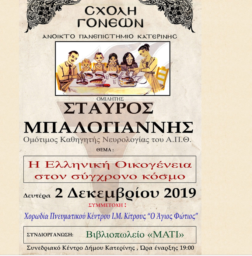 “Η Ελληνική Οικογένεια στον σύγχρονο κόσμο” είναι το θέμα που θα διαπραγματευτεί με το κοινό της Σχολής Γονέων – Ανοικτό Πανεπιστήμιο Κατερίνης την Δευτέρα 2 Δεκεμβρίου ο Ομότιμος Καθηγητής Νευρολογίας του Α.Π.Θ. κ. Σταύρος Μπαλογιάννης.