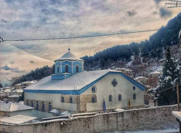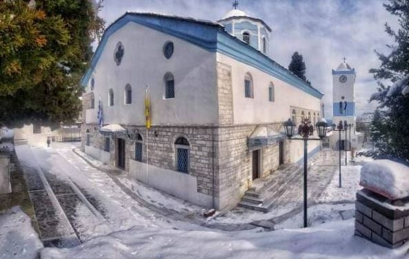 Στις εικόνες διακρίνεται και ο χιονισμένος Ιερός Ναός Κοιμήσεως της Θεοτόκου.