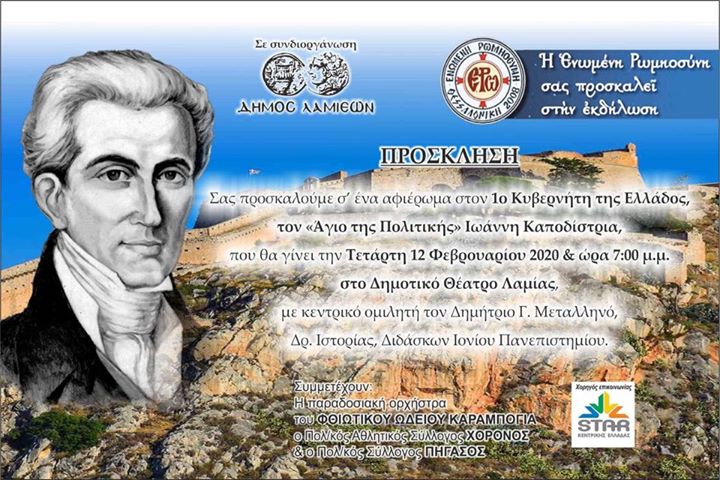 Η ΕΝΩΜΕΝΗ ΡΩΜΙΟΣΥΝΗ, σε συνδιοργάνωση με τον Δήμο Λαμιέων, μάς προσκαλεί σε ένα αφιέρωμα στον 1ο Κυβερνήτη της Ελλάδος, τον “Άγιο της Πολιτικής” Ιωάννη Καποδίστρια, που θα γίνει την Τετάρτη 12 Φεβρουαρίου 2020 και ώρα 7.00 στο Δημοτικό Θέατρο Λαμίας, με κεντρικό ομιλητή τον Δημήτριο Γ. Μεταλληνό, Δρ. Ιστορίας, Διδάσκων Ιονίου Πανεπιστημίου.