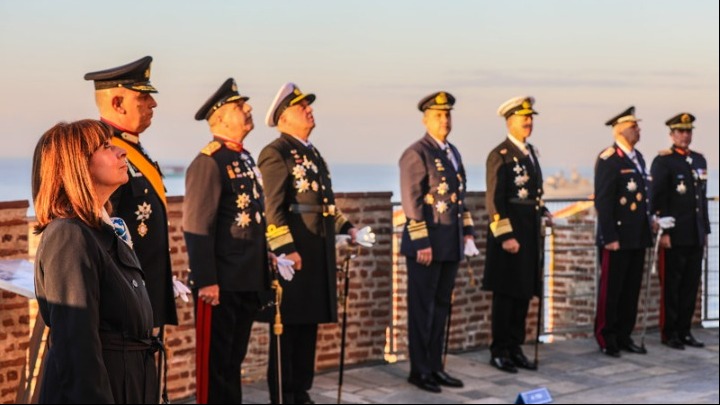 Στην τελετή έπαρσης της σημαίας στην κορυφή του Λευκού Πύργου παρέστη η Πρόεδρος της Δημοκρατίας, Κατερίνα Σακελλαροπούλου, ανήμερα του πολιούχου Αγίου Δημητρίου και της επετείου απελευθέρωσης της Θεσσαλονίκης.