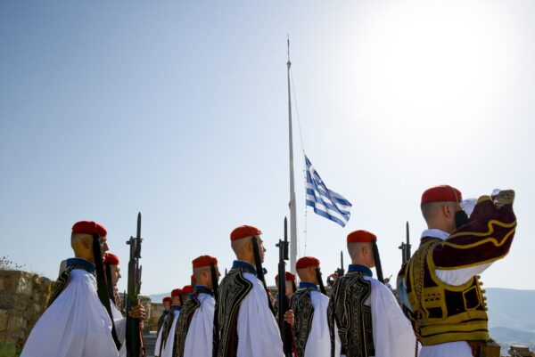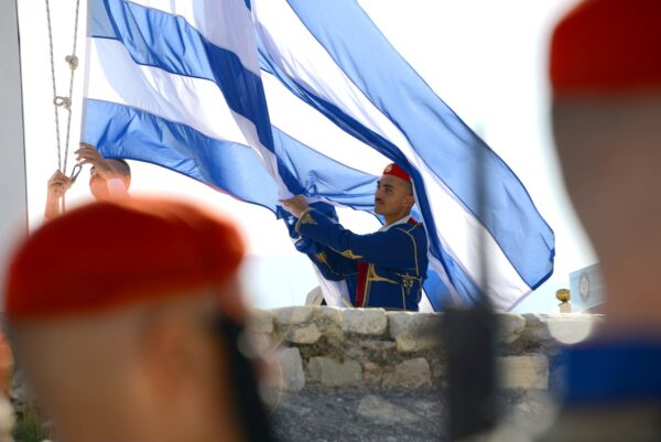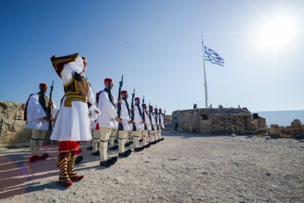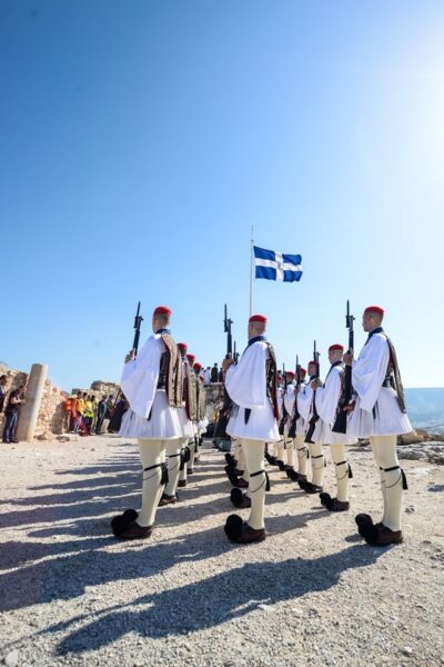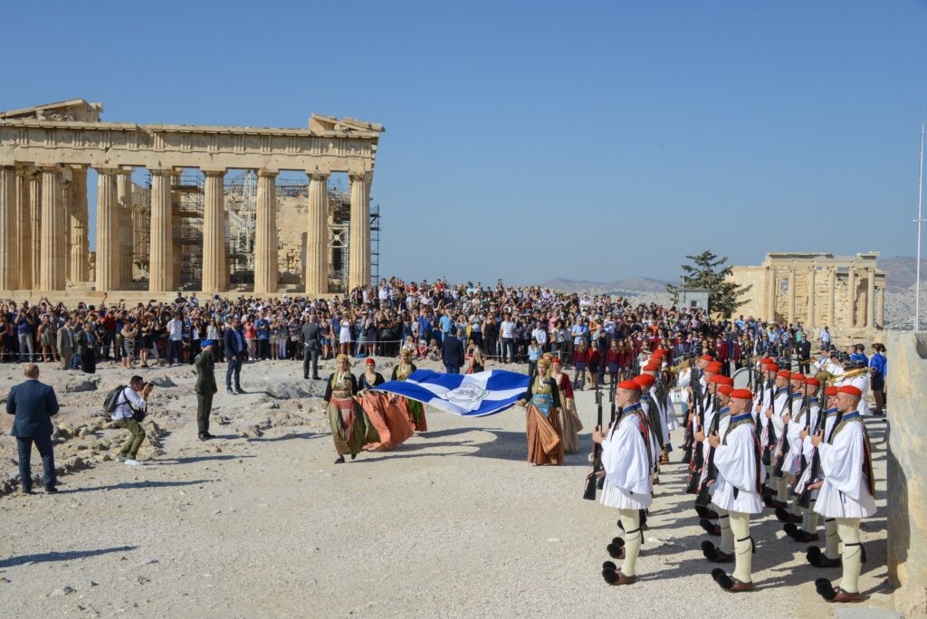 Η επετειακή έπαρση της ελληνικής σημαίας για τα 75 χρόνια από την απελευθέρωση της Αθήνας από τα κατοχικά στρατεύματα, στις 12 Οκτωβρίου 1944, έγινε το πρωί στον βράχο της Ακρόπολης.