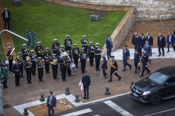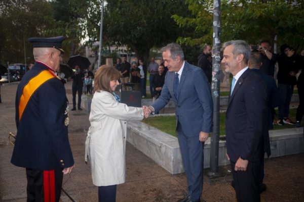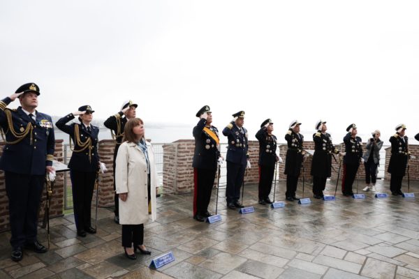 Την Πρόεδρο της Δημοκρατίας υποδέχθηκαν στην είσοδο του Λευκού Πύργου ο δήμαρχος Θεσσαλονίκης Κωνσταντίνος Ζέρβας και ο αρχηγός ΓΕΕΘΑ Κωνσταντίνος Φλώρος και στη συνέχεια ανέβηκαν στην κορυφή όπου βρίσκεται ο ιστός.