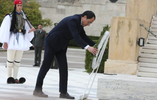 Νωρίτερα το πρωί ο Πρόεδρος Χριστοδουλίδης, συνοδευόμενος από την σύζυγό του, Φιλίππα Καρσερά Χριστοδουλίδη κατέθεσε στεφάνι στο Μνημείο του Άγνωστου Στρατιώτη μπροστά από τη Βουλή των Ελλήνων.