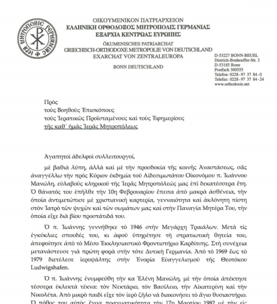 Η επιστολή του Μητρ. Γερμανίας σχετικά με την εκδημία του π. Ιωάννου Μανώλη