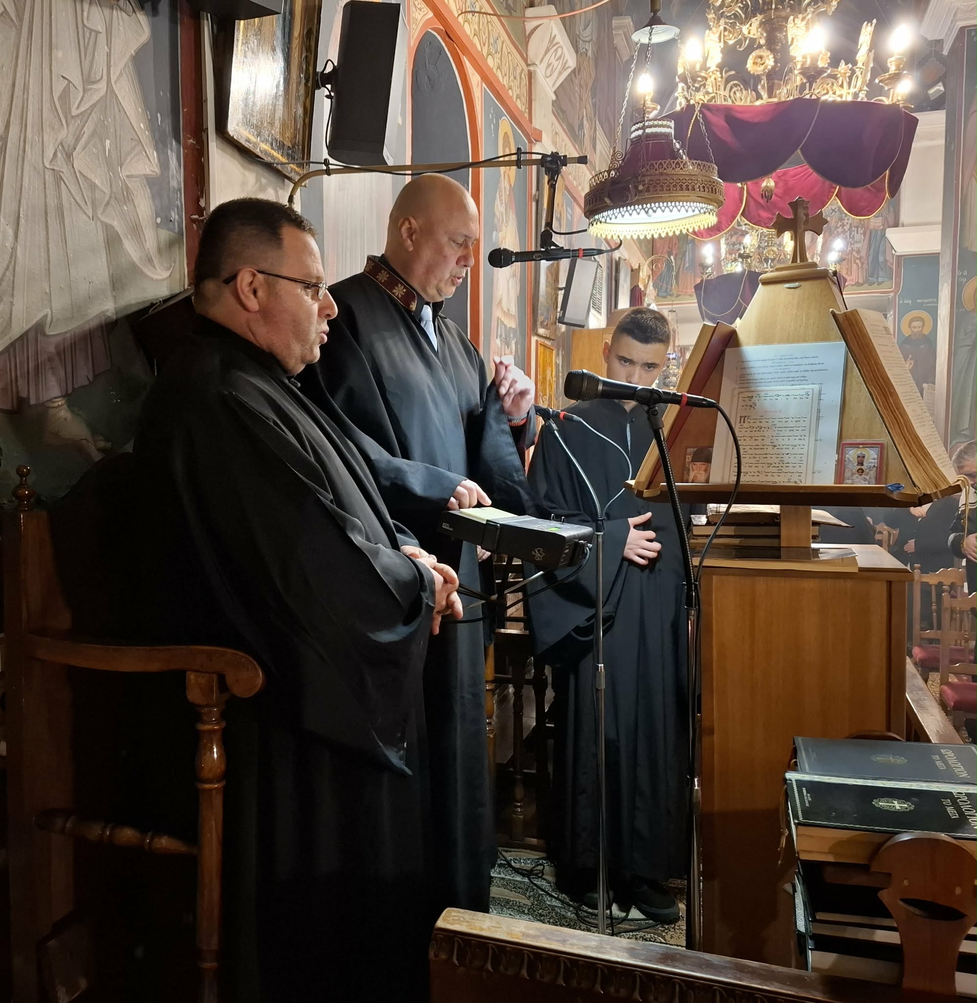 Επίσης τους ύμνους απέδωσαν ο Πρωτοψάλτης του ιερού ναού κ. Ευάγγελος Πολύχρονος, ο Ιεροψάλτης του ιερού ναού κ. Δημήτριος Πετρογιάννης, με τον Αναγνώστη του ιερού ναού Ανάργυρο Αργύρη.