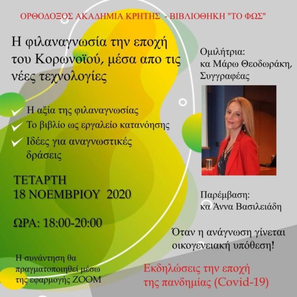 «Η φιλαναγνωσία την εποχή του Κορωνοϊού, μέσα από τις νέες τεχνολογίες». Η διαδικτυακή εκδήλωση θα πραγματοποιηθεί την Τετάρτη 18 Νοεμβρίου 2020 και ώρα 18:00-20:00, με ομιλήτρια την κα Μάρω Θεοδωράκη, Συγγραφέα παιδικών βιβλίων, η οποία θα μιλήσει για την αξία της φιλαναγνωσίας,