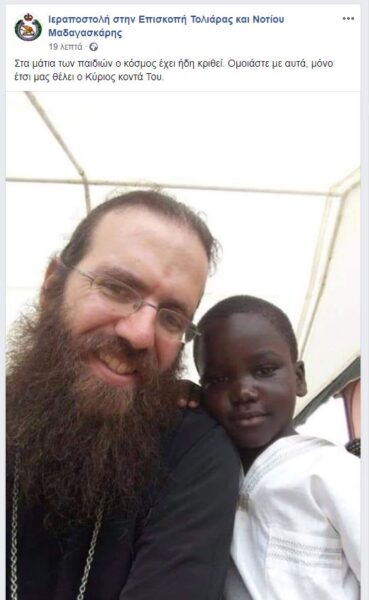 Την ως άνω ΦΩΤΟ, δημοσιεύει, σήμερα, 24 Ιουνίου 2019, η σελίδα “Ιεραποστολή στην Επισκοπή Τολιάρας και Νοτίου Μαδαγασκάρης” στο πλαίσιο του ηλεκτρονικού κοινωνικού δικτύου Facebook, υπό το εύστοχο σχόλιο: “Στα μάτια των παιδιών, ο κόσμος έχει ήδη κριθεί. Ομοιάστε με αυτά, μόνον έτσι μάς θέλει ο Κύριος κοντά Του”. Στη φώτο, ο Επίσκοπος Τολιάρας και Νοτίου Μαδαγασκάρης, κ. Πρόδρομος, στο πλαίσιο της ιεραποστολικής δράσεώς του.