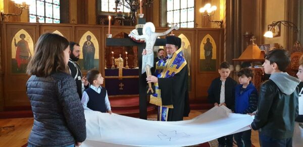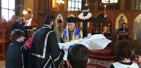 Ο Σεβασμιώτατος Μητροπολίτης Σουηδίας, κ. Κλεόπας, τελεί την Αποκαθήλωση υποβοηθούμενος απο τα μικρά παιδιά.