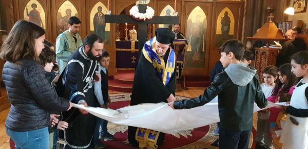 Ο Σεβασμιώτατος Μητροπολίτης Σουηδίας, κ. Κλεόπας, τελεί την Αποκαθήλωση υποβοηθούμενος απο τα μικρά παιδιά.