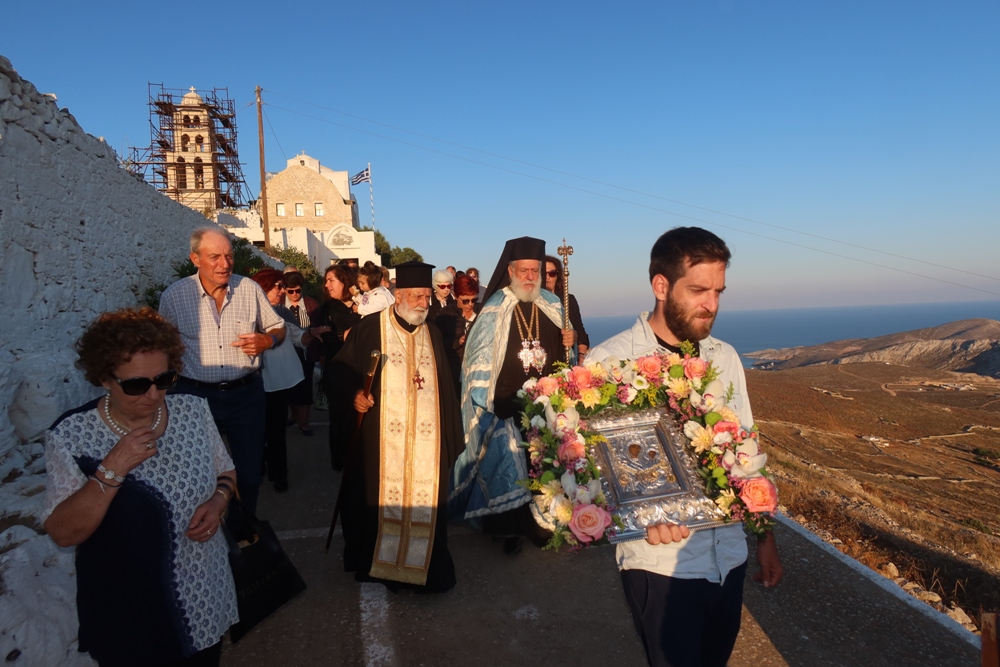 Αμέσως μετά την άφιξη του, η ιερά Εικόνα της Παναγίας μεταφέρθηκε λιτανευτικώς από την οικία του Πανηγυρά στον μοναδικής αρχιτεκτονικής περικαλλή Ιερό Ναό της Παναγίας, στην περιοχή «Παλαιόκαστρο», όπου και ετελέσθη Αρχιερατικός Εσπερινός, προεξάρχοντος του Σεβασμιωτάτου κ. Δωροθέου Β’, με τη συμμετοχή των δύο Εφημερίων του νησιού των ευσεβών κατοίκων του. Μετά το πέρας του Εσπερινού, η αγία Εικόνα μεταφέρθηκε λιτανευτικώς στον Ιερό Ναό του Αγίου Νικολάου, όπου αύριο το πρωί θα τελεσθεί Αρχιερατική Θεία Λειτουργία.