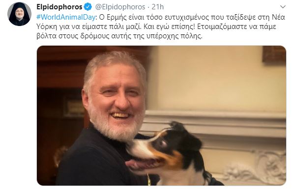 Ο Σεβασμιώτατος Αρχιεπίσκοπος Αμερικής, κ. Ελπιδοφόρος, σε επίκαιρη ανάρτηση του με αφορμή την Παγκόσμια Ημέρα Ζώων, αναφέρει: “Ο Ερμής είναι τόσο ευτυχισμένος που ταξίδεψε στη Νέα Υόρκη για να είμαστε πάλι μαζί. Και εγώ επίσης! Ετοιμαζόμαστε να πάμε βόλτα στους δρόμους αυτής της υπέροχης πόλης”.