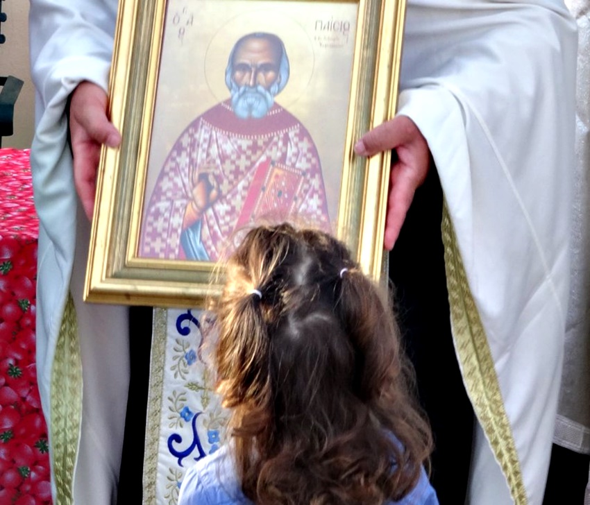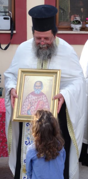 Με λαμπρότητα εορτάστηκε στη Λέρο η μνήμη του Οσίου και Θεοφόρου Πατρός ημών Παϊσίου Παναγή Μπασιά (του εν Ληξουρίω Κεφαλληνίας), από όπου αλιεύουμε τη φωτογραφία της σημερινής ημέρας. Ένα μικρό κορίτσι ενώπιον του Αγίου, παρατηρεί τη μορφή του στην Eικόνα την οποία ευλαβικά κρατάει ο Εφημέριος.