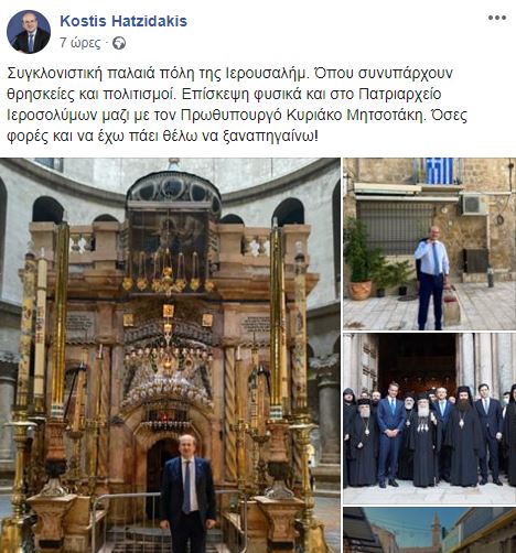 “Συγκλονιστική παλαιά πόλη της Ιερουσαλήμ. Όπου συνυπάρχουν θρησκείες και πολιτισμοί. Επίσκεψη φυσικά και στο Πατριαρχείο Ιεροσολύμων μαζι με τον Πρωθυπουργό Κυριάκο Μητσοτάκη. Όσες φορές και να έχω πάει, θέλω να ξαναπηγαίνω!” γράφει ο Υπουργός Περιβάλλοντος και Ενέργειας, κ. Κωστής Χατζηδάκης, σε επίκαιρη ανάρτησή του.
