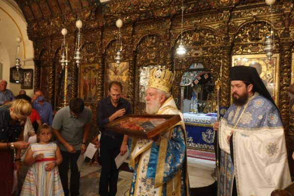 Πλήθος φιλευσεβών Μυκονίων και παρεπιδημούντων παραθεριστών κατέκλυσαν το Καθολικό και τους αύλιους χώρους της πολυαιώνιας Ιεράς και ιστορικής Μονής της Παναγίας Τουρλιανής, στην Άνω Μερά Μυκόνου, όπου τελέσθηκε ο Μέγας Εσπερινός της Αποδόσεως της Κοιμήσεως της Θεοτόκου, προεξάρχοντος του Σεβασμιωτάτου κ. Δωροθέου Β’. Ο Σεβασμιώτατος, στην ομιλία του, υπογράμμισε ότι είναι η Παναγία που υποδέχεται απόψε τους πιστούς στην πολυαιώνια Μονή της και δείχνει σε όλους το δρόμο της υπομονής στο δύσκολο μονοπάτι της ζωής.
