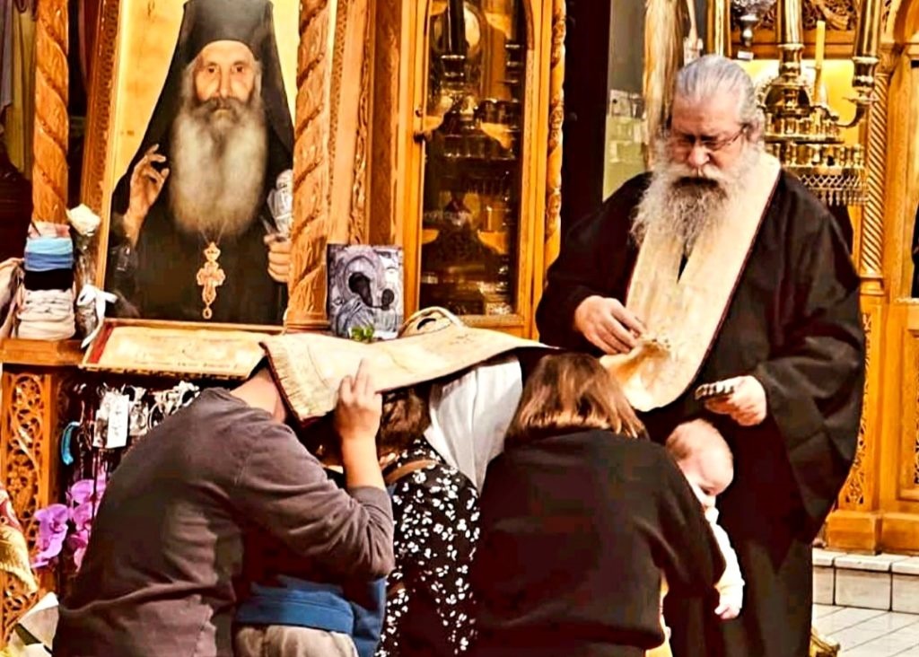 Ευλαβείς πιστοί υπό το πετραχήλι του Καθηγουμένου της Ιεράς Μονής Οσίου Δαυίδ Ευβοίας Αρχιμ π. Γαβριήλ.