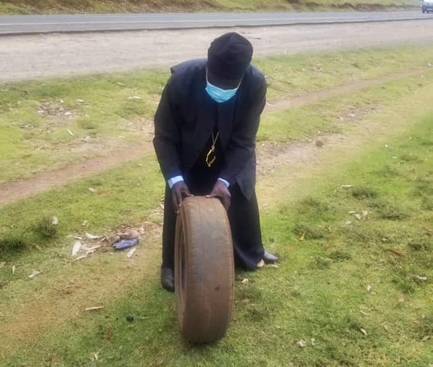“Το πρωινό μας επεισόδιο στον δρόμο για την εκκλησία” αναφέρει ο Θεοφιλέστατος Επίσκοπος Νιέρι και Όρους Κένυας κ. Νεόφυτος. “Τα καταφέραμε” συμπληρώνει. Στα επίκαιρα φωτογραφικά στιγμιότυπα βοηθάει, συνεισφέροντας και ο ίδιος στην αντικατάσταση ενός σκασμένου λάστιχου.
