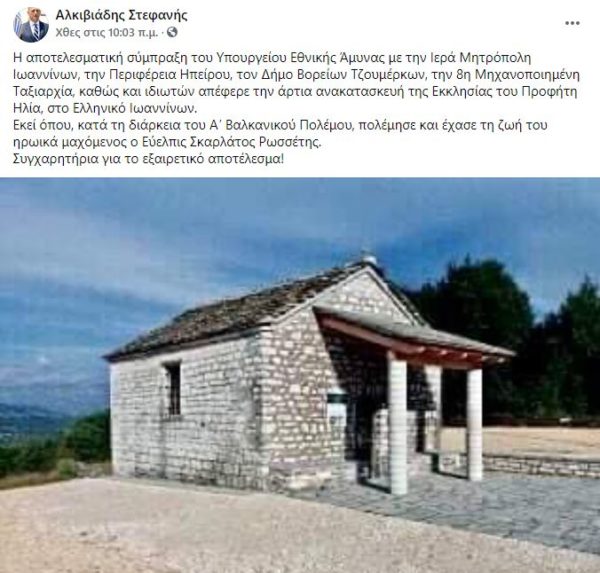 “Η αποτελεσματική σύμπραξη του Υπουργείου Εθνικής Άμυνας με την Ιερά Μητρόπολη Ιωαννίνων, την Περιφέρεια Ηπείρου, τον Δήμο Βορείων Τζουμέρκων, την 8η Μηχανοποιημένη Ταξιαρχία, καθώς και ιδιωτών απέφερε την άρτια ανακατασκευή της Εκκλησίας του Προφήτη Ηλία, στο Ελληνικό Ιωαννίνων. Εκεί όπου, κατά τη διάρκεια του Α΄ Βαλκανικού Πολέμου, πολέμησε και έχασε τη ζωή του ηρωικά μαχόμενος ο Εύελπις Σκαρλάτος Ρωσσέτης. Συγχαρητήρια για το εξαιρετικό αποτέλεσμα!”. Αυτά αναφέρει σε επίκαιρη ανάρτησή του, ο Υφυπουργός Εθνικής Άμυνας κ. Αλκιβιάδης Στεφανής, αναρτώντας το ως άνω φωτογραφικό στιγμιότυπο.
