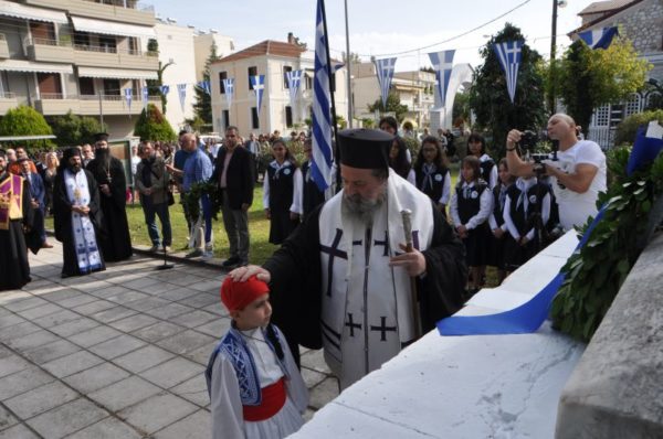 Στη συνέχεια εψάλη τρισάγιο στον ανδριάντα του Παύλου Μελά που βρίσκεται δίπλα στον Ιερό Ναό και έγινε κατάθεση στεφάνων. Τον Σεβασμιώτατο συνόδευσε στην κατάθεση ένα μικρό αγόρι ντυμένο παραδοσιακή στολή.