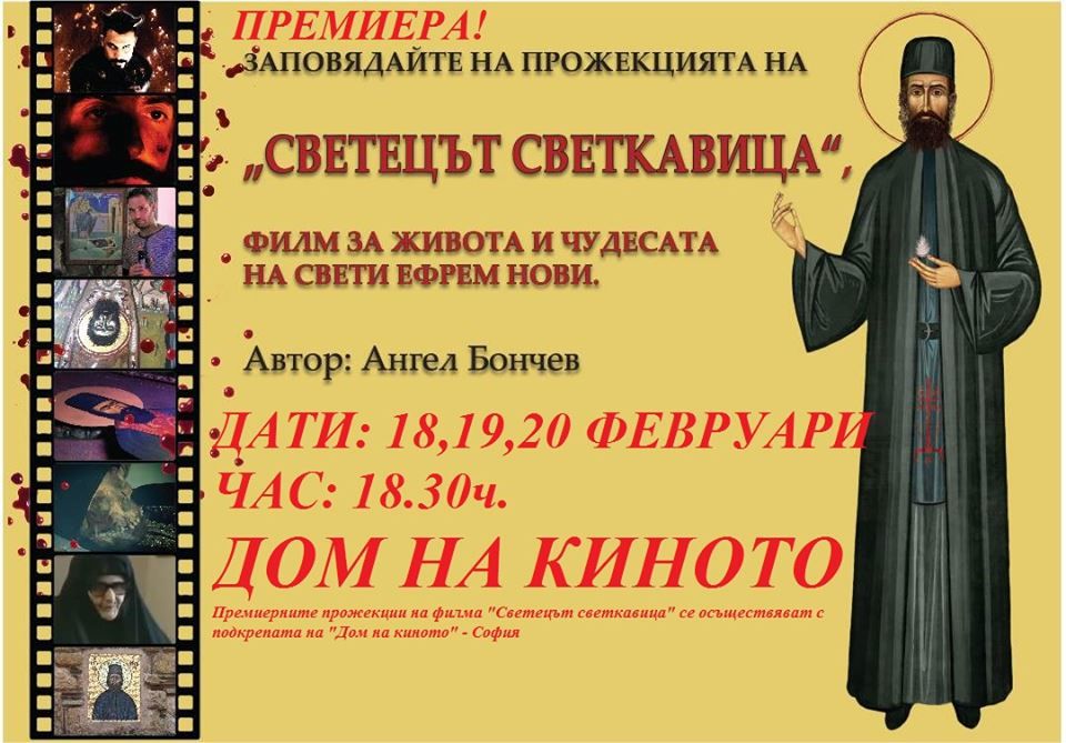 Στην κατάμεστη αίθουσα του σινεμά «Σπίτι του Κινηματογράφου» στην Σόφια πραγματοποιήθηκε την Τρίτη 18 Φεβρουαρίου 2020, η πρεμιέρα του βουλγαρικού ντοκιμαντέρ με τίτλο «Ο Άγιος – Αστραπή», το οποίο είναι αφιερωμένο στον βίο και το έργο του Αγίου Εφραίμ του Μεγαλομάρτυρα και Θαυματουργού (της Νέας Μάκρης), απο όπου αλιεύουμε τη φωτογραφία (αφίσα της πρεμιέρας) της σημερινής ημέρας.