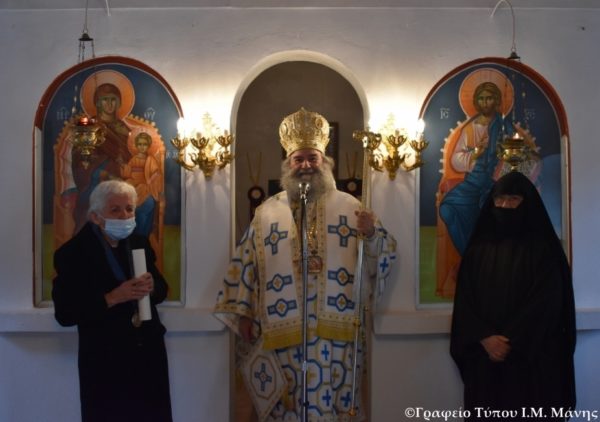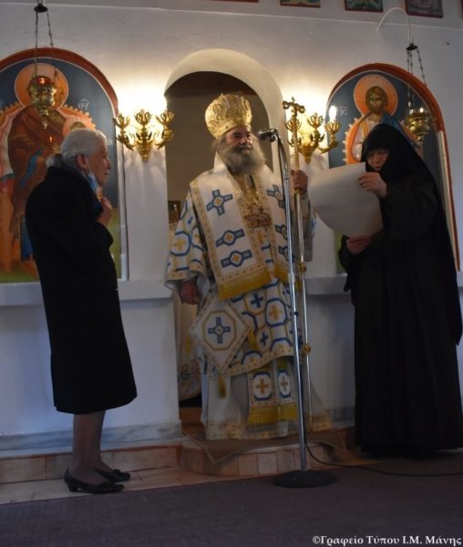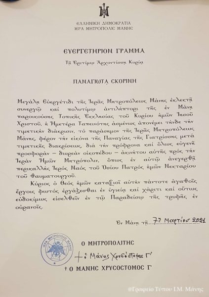 Την Κυριακή της Απόκρεω, ο Σεβ. Μητροπολίτης Μάνης κ. Χρυσόστομος μετά το πέρας της Θ. Λειτουργίας, που τέλεσε στον Ι. Ναό Ζωοδόχου Πηγής Μαυροβουνίου-Γυθείου, τίμησε με το παράσημο της Ιεράς Μητροπόλεως Μάνης, φέρον την εικόνα της Παναγίας της Γιατρίσσης μετά τιμητικής διακρίσεως, την αρχόντισσα κυρία Παναγιώτα Σκορίνη, δωρήτρια στην Ι. Μητρόπολη Μάνης, κτήματός εκτάσεως 5.638 τμ, στη θέση «Σελινίτσα» Γυθείου, με αποκλειστικό σκοπό την ανέγερση Ιερού Ναού του Αγίου Νεκταρίου.