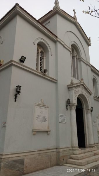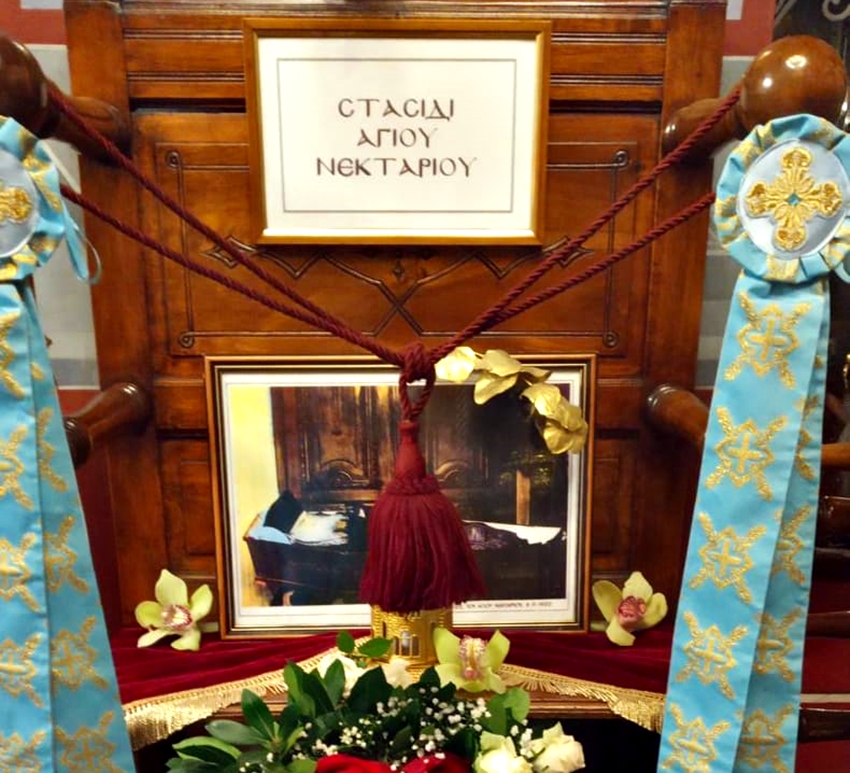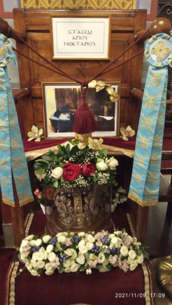 Το στασίδι του Αγίου Νεκταρίου Πενταπόλεως στην εκκλησία του Αγίου Γεωργίου στο κέντρο της Αθήνας σε φωτογραφικό στιγμιότυπο την ημέρα της εορτής του, 9 Νοεμβρίου 2021.