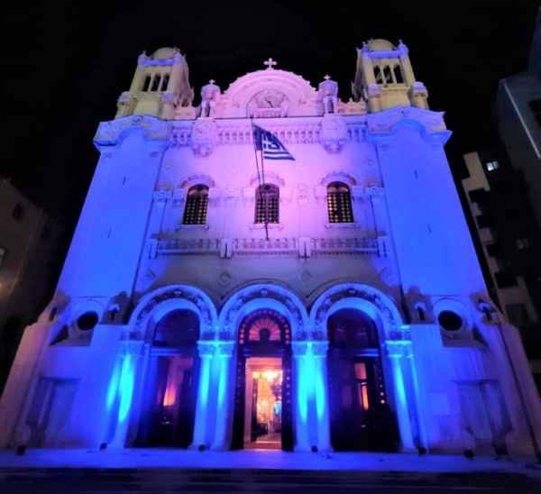 Στα χρώματα της γαλανόλευκης φωτίζεται αυτές τις ημέρες ο ιστορικός ναός του Ευαγγελισμού στην Αλεξάνδρεια της Αιγύπτου, μία από τις μεγαλύτερες εκκλησίες στην ομογένεια, με την πρεσβυγενή Ελληνική Κοινότητα Αλεξανδρείας να συμμετέχει ενεργά στους εορτασμούς της Ελλάδας για τα 200 χρόνια από την Ελληνική Επανάσταση του 1821.