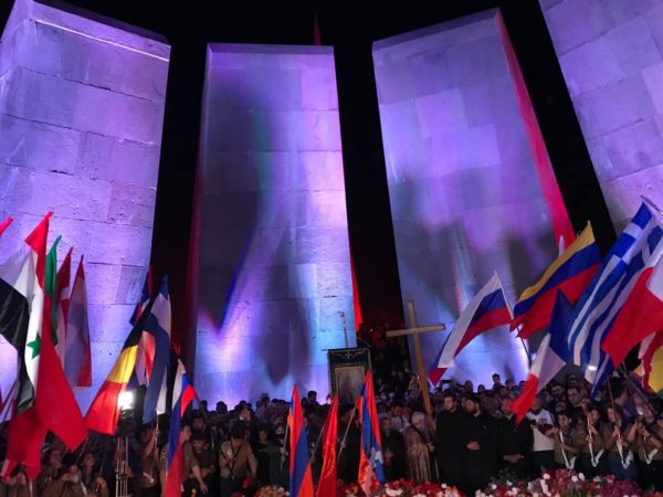 Η ελληνική σημαία μπροστά στην άσβεστη φλόγα στο μνημείο Γενοκτονίας Τζιτζερνακαπέρτ στο Ερεβάν, μαζί με τις σημαίες όλων των χωρών που έχουν αναγνωρίσει τη Γενοκτονία των Αρμενίων.