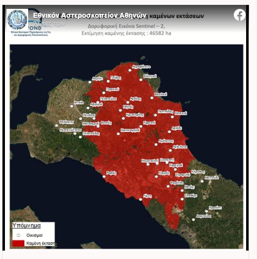 Περίπου 465.820 στρέμματα είναι η καμένη έκταση στην Βόρεια Εύβοια από τις πυρκαγιές. Ο υπολογισμός έγινε ύστερα από επεξεργασία τεσσάρων δορυφορικών εικόνων υψηλής ανάλυσης του ευρωπαϊκού δορυφόρου Sentinel-2 (λήψη εικόνων στις 11/8) από την επιχειρησιακή μονάδα BEYOND του Ινστιτούτου ΙΑΑΔΕΤ του Εθνικού Αστεροσκοπείου Αθηνών, όπως μεταδίδει το Αθηναϊκό Πρακτορείο Ειδήσεων.