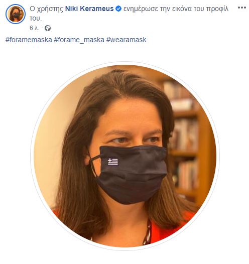 Εξάλλου, πριν λίγα λεπτά, και λίγο πριν τις δέκα το βράδυ, η Νίκη Κεραμέως ανανέωσε την εικόνα του προφίλ της στο κοινωνικό δίκτυο Facebook, φορώντας μάσκα: