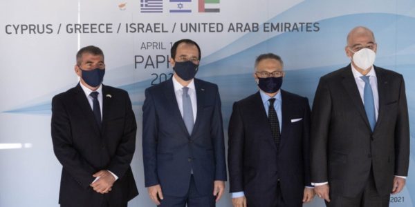 Ισχυρό μήνυμα ασφάλειας και σταθερότητας για την περιοχή της Ανατολικής Μεσογείου έστειλαν οι υπουργοί Εξωτερικών Ελλάδας, Κύπρου, Ισραήλ και Ηνωμένων Αραβικών Εμιράτων, στην τετραμερή συνάντησή τους στην Πάφο την Παρασκευή.