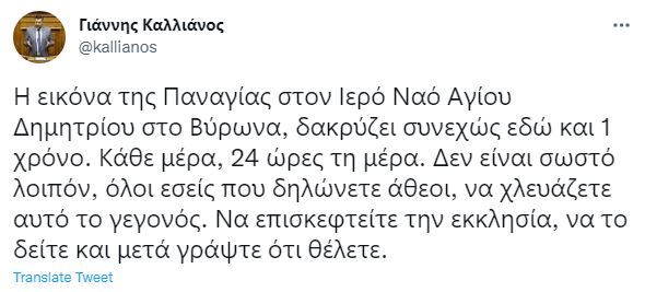 Την απάντηση του σε όλους όσοι θεωρούν ότι Επιστήμη και Χριστός δεν μπορούν να πάνε μαζί, έδωσε ο Βουλευτής του Νοτίου Τομέα της Β’ Αθηνών κ. Γιάννης Καλλιάνος. Το έπραξε με σεβασμό στις απόψεις όλων και στη θρησκεία όλων, με αφορμή την πολεμική που δέχτηκε μετά την πολυσυζητημένη ανάρτησή του, ότι, η εικόνα της Παναγίας στον Ιερό Ναό Αγίου Δημητρίου στον Βύρωνα δακρύζει συνεχώς εδώ και 1 χρόνο. “Κάθε μέρα, 24 ώρες τη μέρα. Δεν είναι σωστό λοιπόν, όλοι εσείς που δηλώνετε άθεοι, να χλευάζετε αυτό το γεγονός. Να επισκεφτείτε την εκκλησία, να το δείτε και μετά γράψτε ότι θέλετε” είπε με έμφαση ο Βουλευτής, προχωρώντας με παρρησία σε δημόσια ομολογία Πίστεως.