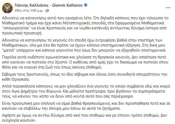 “Αδυνατώ να κατανοήσω αυτό που ορισμένοι λέτε. Ότι δηλαδή κάποιος που έχει τελειώσει το Μαθηματικό τμήμα και έχει κάνει Μεταπτυχιακές σπουδές στα Εφαρμοσμένα Μαθηματικά “απαγορεύεται” να είναι Χριστιανός και να νιώθει κατάνυξη αντλώντας δύναμη ύστερα από προσωπική προσευχή” ανέφερε καταρχήν ο Βουλευτής. Και συνεχίζει: “Αδυνατώ να κατανοήσω το γεγονός ότι επειδή έχω εντρυφήσει βαθιά στην επιστήμη των Μαθηματικών, όλα μα όλα θα πρέπει να έχουν κάποια επιστημονική εξήγηση. Στη δική μου “ματιά” υπάρχουν και κάποια γεγονότα που ίσως δεν μπορούν να εξηγηθούν επιστημονικά. Παρόλα αυτά ουδέποτε ειρωνεύτηκα και χλεύασα τη θρησκεία κανενός. Δεν απαίτησα ποτέ από κανέναν να πιστεύει στο Χριστό. Ο καθένας από εμάς έχει το δικαίωμα να πιστεύει όπου θέλει και να ενεργεί στη ζωή του όπως εκείνος επιθυμεί”.