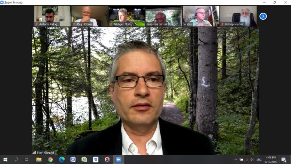 Ο Ευρωβουλευτής Sven Giegold τόνισε τη σημασία της ενεργοποίησης της κοινωνίας των πολιτών σε συνδυασμό και με τις δράσεις των τοπικών Εκκλησιών-Ενοριών-Ακαδημιών, ώστε να υπάρξουν ουσιαστικές πρωτοβουλίες ως απάντηση έναντι της Κλιματικής Κρίσης, που αποτελεί ακόμη μεγαλύτερη απειλή από τον Κορωνοϊό, θέτοντας στο επίκεντρο το φλέγον ζήτημα της επιβίωσης του πλανήτη. Σε αυτή την καίρια συγκυρία, η Ευρωπαϊκή Ένωση αντιτάσσει την Πράσινη Συμφωνία, με στόχο η Ευρώπη να γίνει η πρώτη Ήπειρος που θα είναι κλιματικά ουδέτερη. Το κρίσιμο σημείο σε αυτή την προσπάθεια είναι η μετάβαση αυτή να πραγματοποιηθεί με όρους κοινωνικής δικαιοσύνης και ισότητας των κρατών-μελών και των πολιτών τους, ώστε όλοι να γίνουν κοινωνοί ενός καλύτερου περιβάλλοντος, λαμβάνοντας ιδιαίτερη μέριμνα για τους μετανάστες και τους πρόσφυγες.