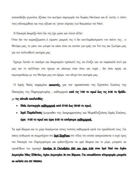 Τα ιερά δάκρυα και το μύρο διανέμονται στους πιστούς καθημερινά κατά την προσέλευσή τους. Για όσους επιθυμούν να συμμετέχουν στο Ιερό Ευχέλαιο στο τέλος του οποίου αναγινώσκεται η ευχή προς την Παναγία την Παρηγορήτρια και εμβαπτίζονται τα ιερά δάκρυα και το μύρο, μπορούν να προσέλθουν την προσεχή Δευτέρα 18 Οκτωβρίου 2021 και ώρα 6:00 στον Ιερό Ναό του Αγίου Δημητρίου Νέας Ελβετίας, Αγίου Δημητρίου 36 στο Βύρωνα.