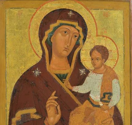 Πρόκειται για μία εικόνα της “Οδηγήτριας Σεντμιεζέρναγια”, που απεικονίζει την Θεοτόκο να ευλογεί τους πιστούς.