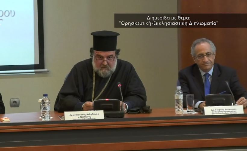 Ο Σεβασμιότατος Αρχιεπίσκοπος Ανθηδώνος κ. Νεκτάριος κατά την ομιλία του με θέμα «Το Πατριαρχείο Ιεροσολύμων ως παράγων σταθερότητος και διαλόγου στη Μέση Ανατολή», στη διημερίδα για τη θρησκευτική και εκκλησιαστική διπλωματία που πραγματοποιήθηκε στο Υπουργείο εξωτερικών ανέφερε μεταξύ άλλων: «Το Ορθόδοξο Πατριαρχείο Ιεροσολύμων είναι μια αδιάσπαστη ιστορική αλυσίδα αγιότητας, μαρτυρίου και συνεχών αγώνων υπέρ της Εκκλησίας του Χριστού και της διαφύλαξης των Αγίων Προσκυνημάτων. Η παρουσία του στην Αγία Γη είναι ένα καθημερινό θαύμα. Μεγάλη πρόκληση είναι η συνύπαρξη του με τον Εβραϊκό και Αραβικό κόσμο και η αποστολή αυτού ως παράγοντα ισορροπίας. Το πρόβλημα της διπλωματίας και των πολιτικών είναι ότι επειδή δεν κατέχουν εις βάθος τα θέματα της θρησκείας προσπαθούν να υποβαθμίσουν τον ρόλο που παίζει η θρησκεία στα γεγονότα που εκτυλίσσονται σε παγκόσμια κλίμακα».