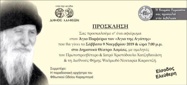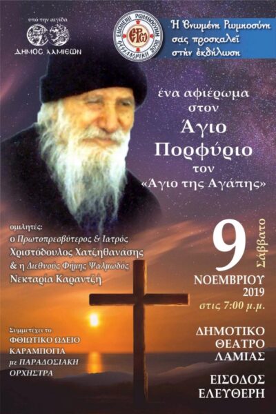 Η “Ενωμένη Ρωμιοσύνη”, υπό την αιγίδα του Δήμου Λαμέων, σας προσκαλεί σε ένα αφιέρωμα στον Άγιο Πορφύριο, τον “Άγιο της Αγάπης”, που θα γίνει το Σάββατο 9 Νοεμβρίου 2019 και ώρα 7.00 μ.μ. στο Δημοτικό Θέατρο Λαμίας, με ομιλητές τον Πρωτοπρεσβύτερο και Ιατρό, Χριστόδουλο Χατζηθανάση, και τη διεθνούς φήμης ψαλμωδό, Νεκταρία Καραντζή.