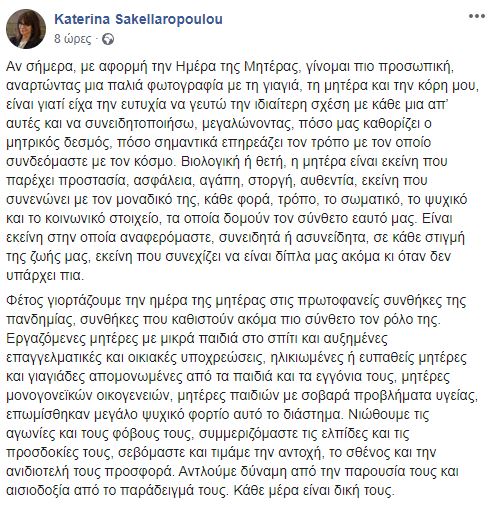 Παράλληλα, τονίζει ότι φέτος γιορτάζουμε την Ημέρα της Μητέρας στις πρωτοφανείς συνθήκες της πανδημίας, συνθήκες που καθιστούν ακόμα πιο σύνθετο τον ρόλο της. «Εργαζόμενες μητέρες με μικρά παιδιά στο σπίτι και αυξημένες επαγγελματικές και οικιακές υποχρεώσεις, ηλικιωμένες ή ευπαθείς μητέρες και γιαγιάδες απομονωμένες από τα παιδιά και τα εγγόνια τους, μητέρες μονογονεϊκών οικογενειών, μητέρες παιδιών με σοβαρά προβλήματα υγείας, επωμίσθηκαν μεγάλο ψυχικό φορτίο αυτό το διάστημα» υπογραμμίζει η κ. Σακελλαροπούλου και καταλήγει σημειώνοντας: «Νιώθουμε τις αγωνίες και τους φόβους τους, συμμεριζόμαστε τις ελπίδες και τις προσδοκίες τους, σεβόμαστε και τιμάμε την αντοχή, το σθένος και την ανιδιοτελή τους προσφορά. Αντλούμε δύναμη από την παρουσία τους και αισιοδοξία από το παράδειγμά τους. Κάθε μέρα είναι δική τους». (Δήμητρα Κατσιμεντέ – ΑΠΕ ΜΠΕ)