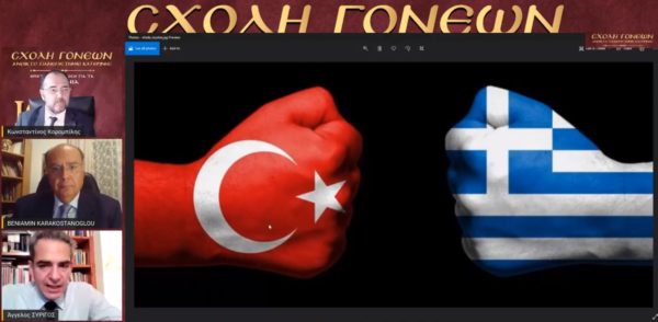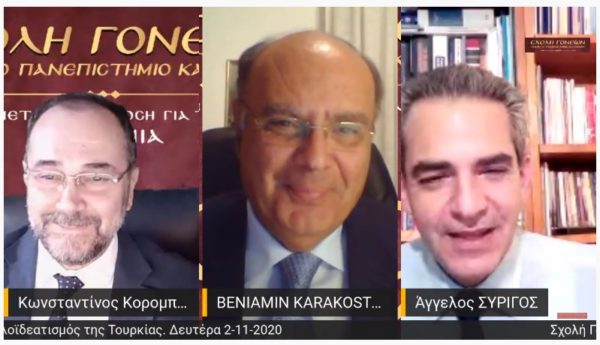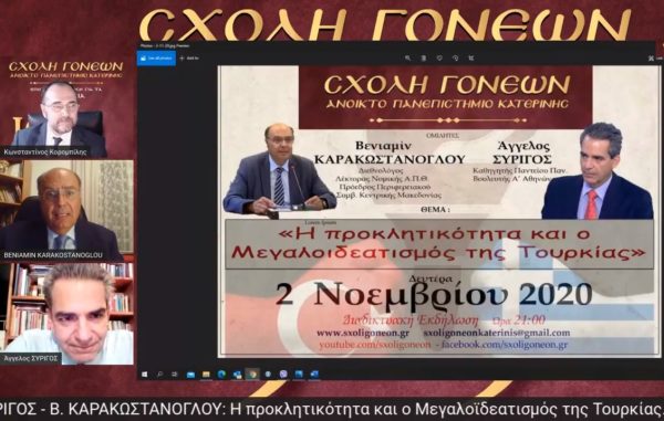 Ο Καθηγητής του Παντείου Πανεπιστημίου και Βουλευτής Α΄ Αθηνών κ. Άγγελος Συρίγος και ο Διεθνολόγος – Λέκτορας Νομικής Α.Π.Θ. και Πρόεδρος του Περιφερειακού Συμβουλίου Κεντρικής Μακεδονίας κ. Βενιαμίν Καρακωστάνογλου ανέπτυξαν την Δευτέρα 2 Νοεμβρίου 2020 διαδικτυακά, το εξαιρετικά επίκαιρο θέμα: «Η προκλητικότητα και ο Μεγαλοϊδεατισμός της Τουρκίας».