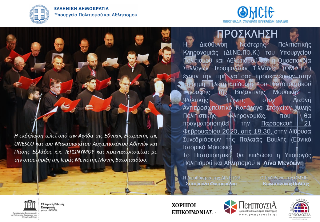 Tην εγγραφή της Βυζαντινής Μουσικής – Ψαλτικής Τέχνης στον Διεθνή Αντιπροσωπευτικό Κατάλογο Στοιχείων Άυλης Πολιτιστικής Κληρονομιάς της Ανθρωπότητας της UNESCO, επισφραγίζουν, γιορτάζουν και δημοσιοποιούν, με ένα διήμερο Εκδηλώσεων, την Παρασκευή 21 και το Σάββατο 22 Φεβρουαρίου 2020, η Διεύθυνση Νεότερης Πολιτιστικής Κληρονομιάς του Υπουργείου Πολιτισμού και Αθλητισμού και η Ομοσπονδία Συλλόγων Ιεροψαλτών Ελλάδος (ΟΜ.Σ.Ι.Ε.).