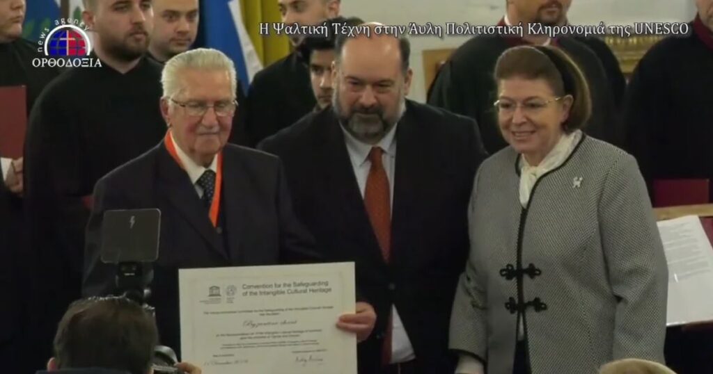 Πραγματοποιήθηκε με επιτυχία το απόγευμα της Παρασκευής 23 Φεβρουαρίου η Επίσημη Τελετή, στην Αίθουσα Συνεδριάσεων της Παλαιάς Βουλής (Εθνικό Ιστορικό Μουσείο, Αθήνα) κατά την οποία η Υπουργός Πολιτισμού και Αθλητισμού κ. Λίνα Μενδώνη επέδωσε στην Ομοσπονδία Συλλόγων Ιεροψαλτών Ελλάδος, ως ανώτατο εκπρόσωπο της εν Ελλάδι Ιεροψαλτικής Κοινότητας, το Αποδεικτικό της εγγραφής στην UNESCO.